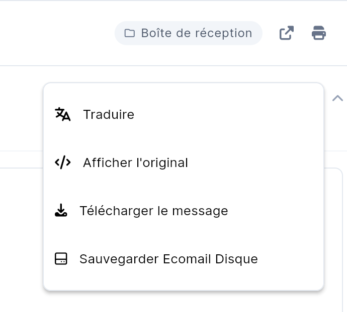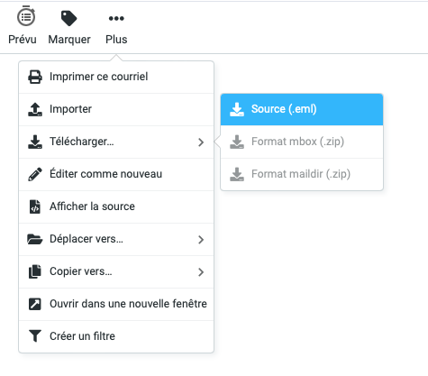 En haut à droite du mail, cliquez sur l'icône "3 points verticaux" puis cliquez sur "Télécharger le message"