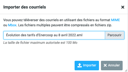 Sélectionnez votre fichier .eml en cliquant sur "Parcourir" puis cliquez sur "Importer".