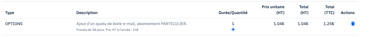 Cela va générer un bon de commande au prorata du temps restant de votre abonnement principal, ceci afin que le X boites e-mails créées depuis votre compte principal soient alignés sur la même date d'expiration.