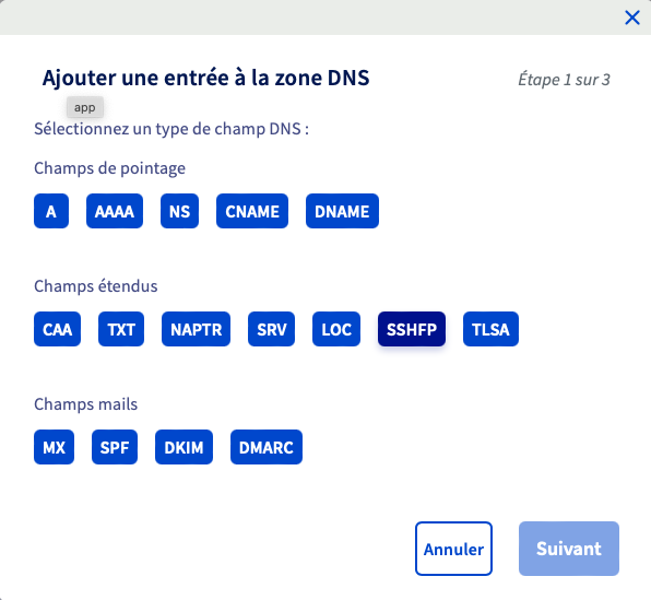 Selon votre besoin, cliquez sur le type de zone DNS nécessaire puis compléter le formulaire d'ajout.