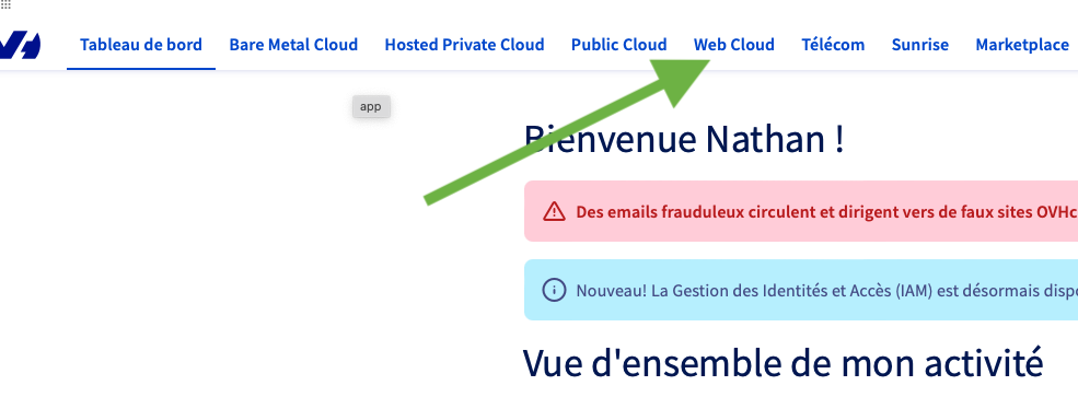 Une fois connecté, cliquez sur le menu "Web Cloud"