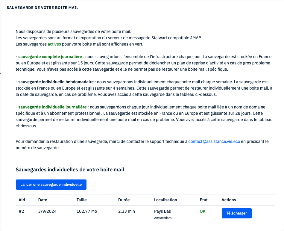 La restauration d'une sauvegarde se fait sur demande au support technique (contact@assistance.vie.eco) en précisant le numéro (#id) de la sauvegarde à restaurer.